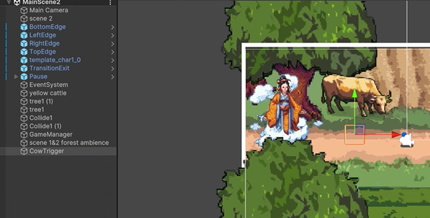 The user interface was another key focus. We designed a Main Menu and Pause Menu using Unity’s Canvas UI, linking interactive buttons to C# functions for easy navigation and settings adjustments. Each scene was thoughtfully crafted with layered backgrounds, midgrounds, and foregrounds to create depth. Visual assets were a blend of AI-assisted designs, pixelation techniques, and hand-drawn animations, resulting in a vibrant and cohesive aesthetic that brought the game world to life. Together, these elements formed the backbone of the game’s structure, delivering a polished and engaging experience.
